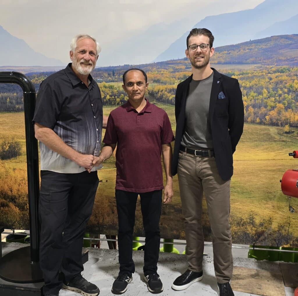 Stream-Flo Group CEO Mark McNeill, left, and Stream-Flo Vice President Global Sales and Strategic Development Kevin McNeill, right, pose for a photo with Vijay during scholarship presentations.